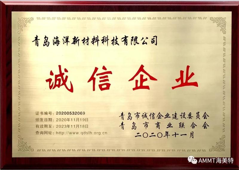 近日,青島海洋新材料科技有限公司參加了青島市誠信企業認證評選活動,青島市誠信建設委員會與青島市商業聯合會對公司的信用狀況進行了評價,同意授予公司“青島市誠信企業”的榮譽稱號。這是公司首次獲得該殊榮,對公司進一步推動市場開發和可持續發展有著重要意義。